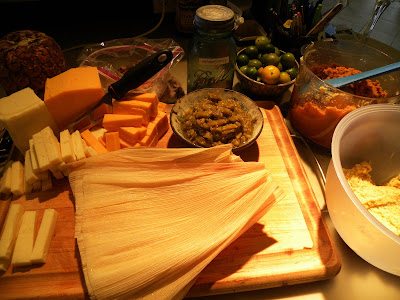 As promised, I am giving you the recipe for tamales. The masa or dough is my basic and most favorite masa, made with fresh corn. I also rendered my own lard. You can see step by step instructions for rendering lard here. The fillings and wrappings can vary greatly in style as well as ingredients. I used dried corn husks that had been soaked for a few hours in hot water. You can also use fresh or frozen banana leaves or Ti leaves but they will need to be softened briefly on a grill so that they will bend but not break. I used lengths of cotton cooking string and strips of the corn husks to tie the tamales, but there are versions that are made folded and not tied at all.