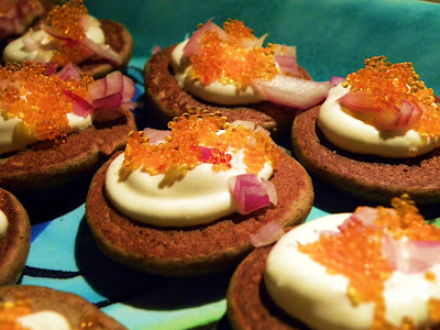 I made Crème Fraîche  to which I added smoked sea salt, crushed black pepper and chives. I put this mixture into a squeeze bottle and I chopped some red onion too. When it was time to assemble, I added a swirl of the Crème Fraîche on a blini, then some chopped red onion and topped that with the jewel like Tomiko. These wonderful little pancakes were the hit of the evening.