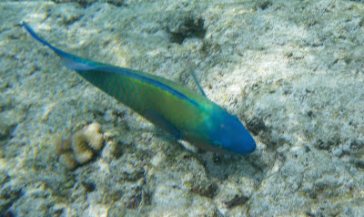 There are an abundance of parrot fish, convict tang, a few types of butterfly fish, porcupine fish, needle fish, puffers, needle fish, wrasses, hawk fish, Moorish idols, several kinds of angel fish, occasional interesting box fish and a few eels. I did see a small "Nemo" (clown fish) yesterday, but that is rather rare there. Yesterday, I encountered a Honu, a sea turtle. She was a juvenile and swam with me for about 100 feet. The corals here are in good shape considering the amount of people that visit this location. On some occasions that I have been there, volunteers educate visitors about how to navigate the bay without damaging the coral.